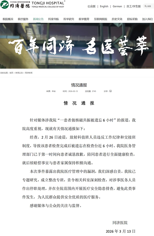 2026年3月13日,华中科技大学同济医学院附属同济医院(以下简称“同济医院”)就“一患者做核磁共振被遗忘6小时”事件发布情况通报,向公众详细说明了事件经过、处理结果及后续整改措施。这起事件不仅引发了患者家属的强烈不满,也在社会上引起了广泛关注,再次为医疗行业敲响了安全警钟。